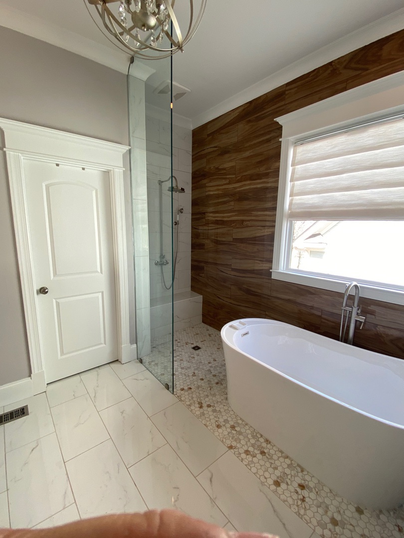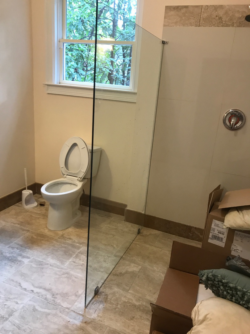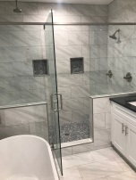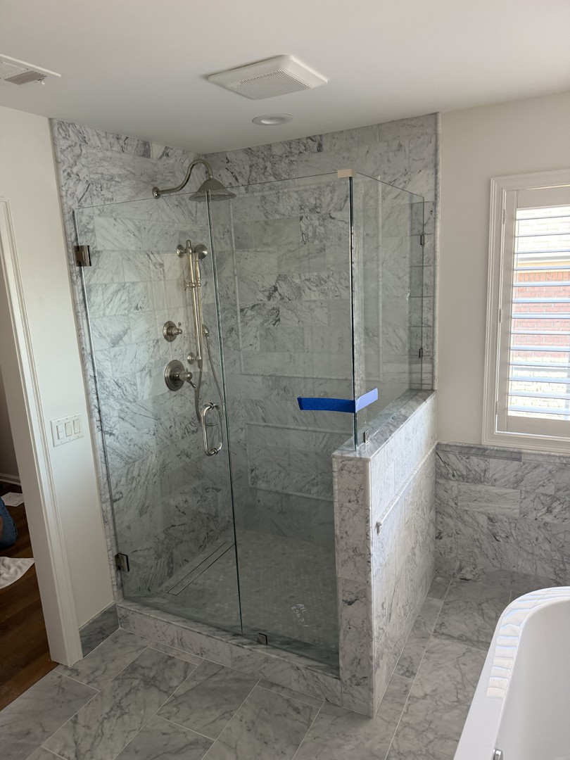 Frameless glass shower panel installed alongside a freestanding tub, installed in Milton, GA.