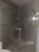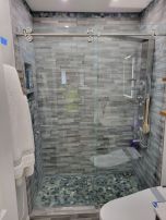 Frameless shower enclosure with brushed nickel hardware, installed in Albany, GA.