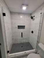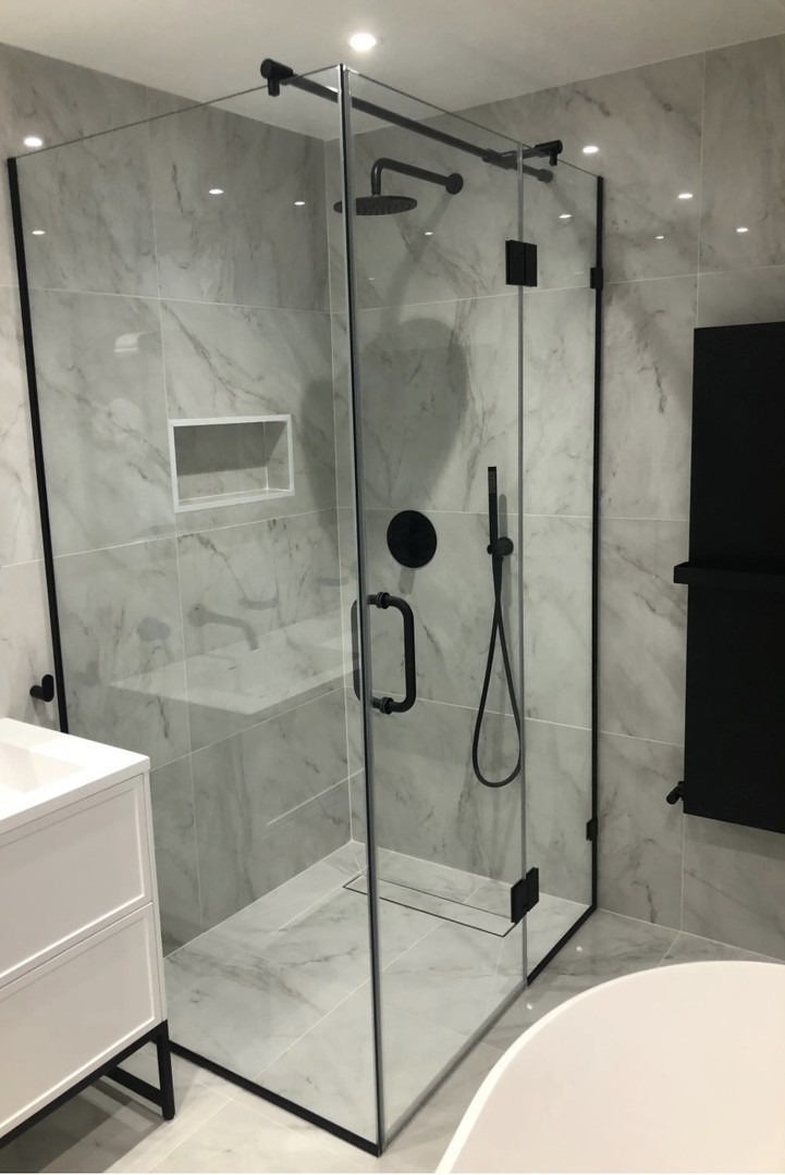 Frameless shower enclosure with matte black hardware, installed in Cumming, GA.