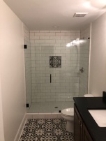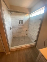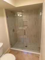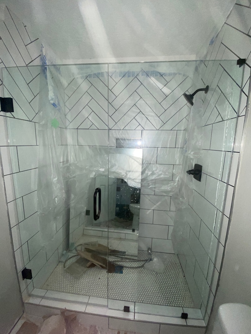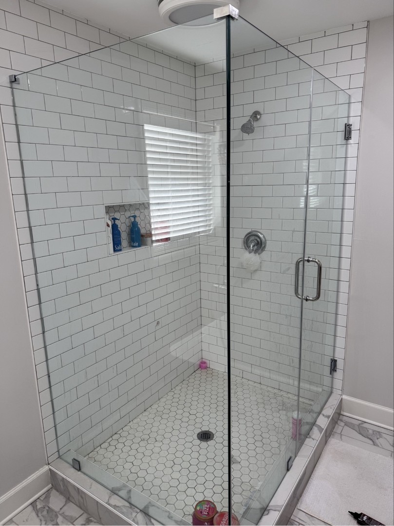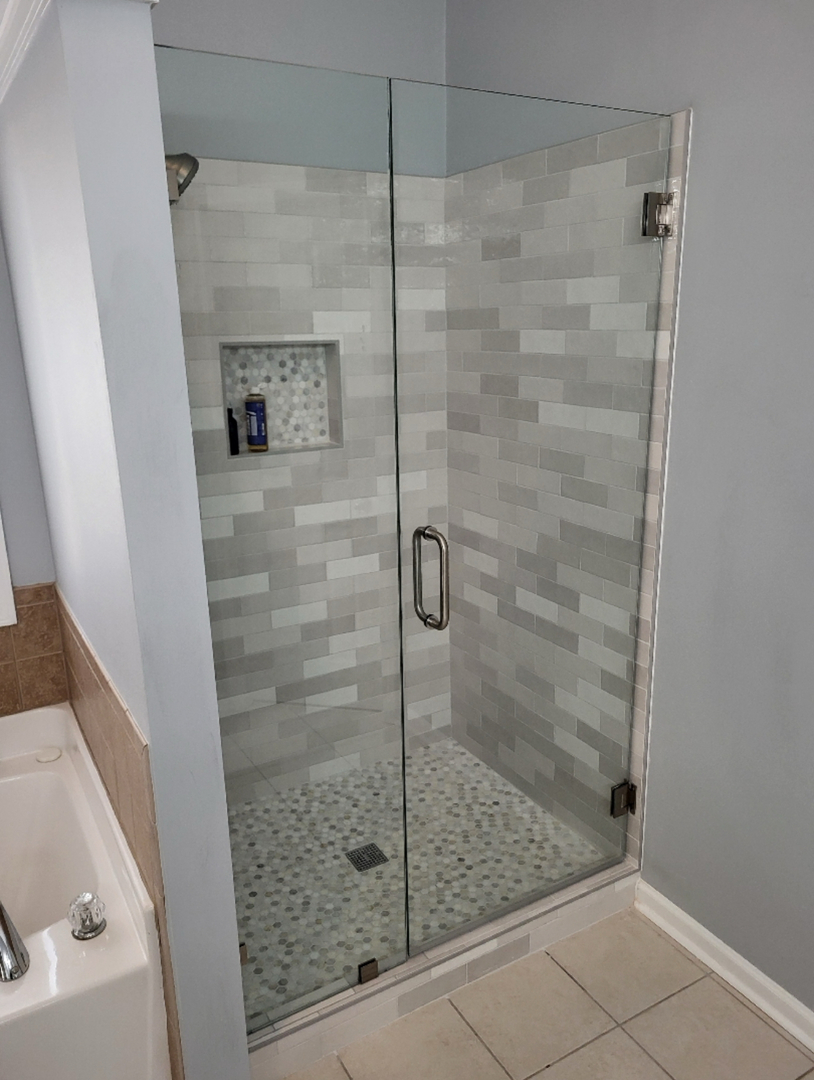Frameless shower enclosure with brushed nickel hinges and handle, installed in Douglasville, GA.