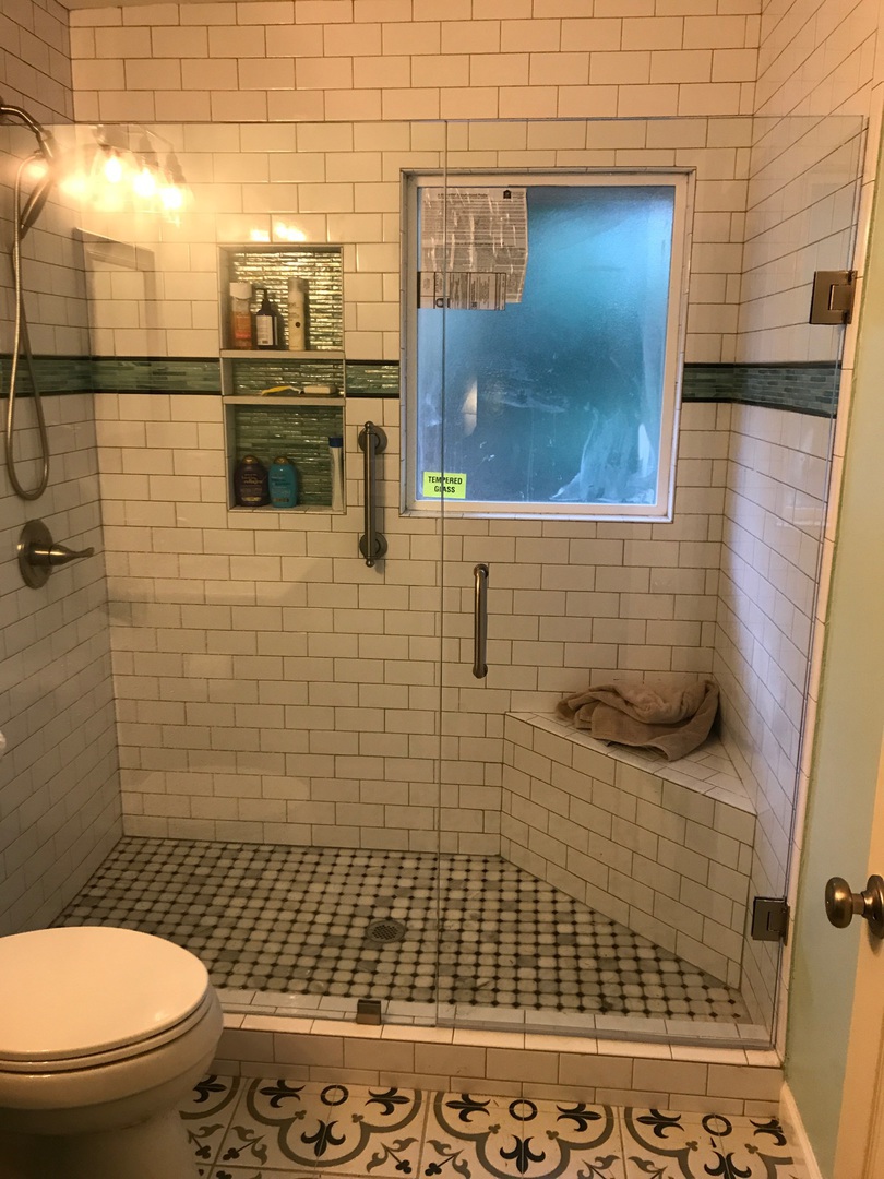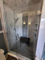 Frameless shower enclosure with clear glass and bench seating, installed in Smyrna, GA.
