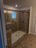 Framed shower enclosure with brushed nickel finish, installed in Snellville, GA.