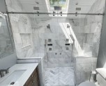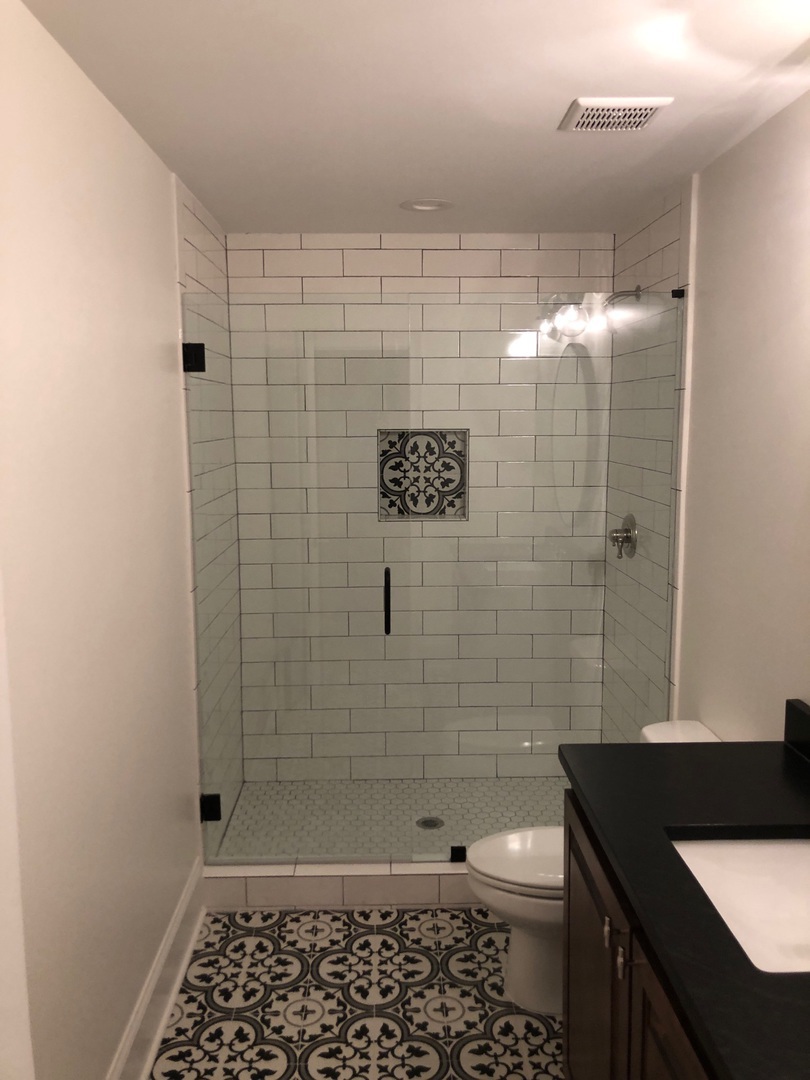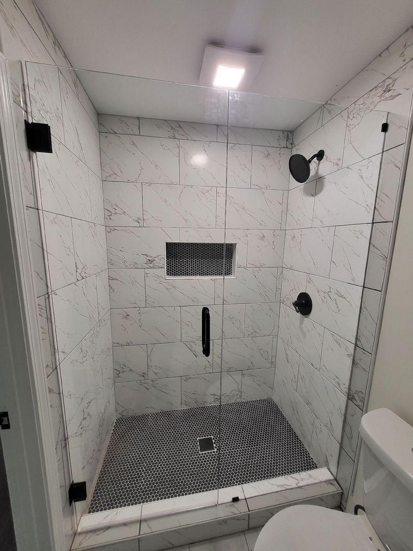 Frameless corner shower enclosure with clear glass and modern hardware, installed in Johns Creek, GA.