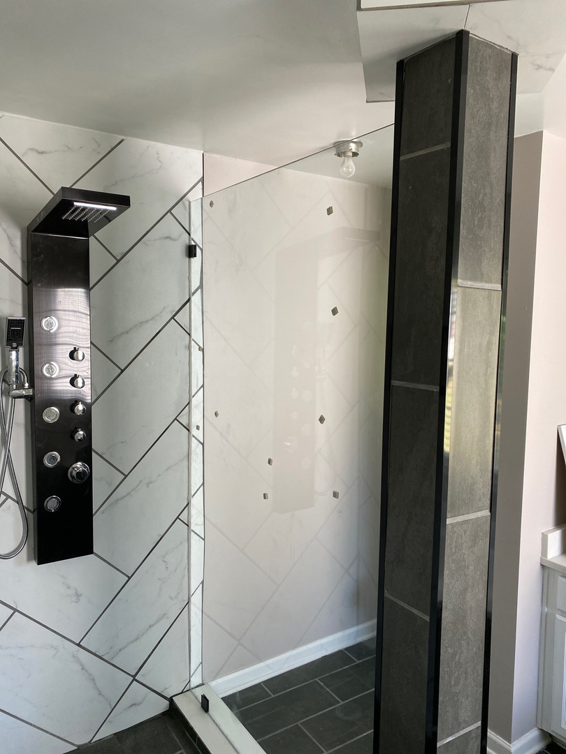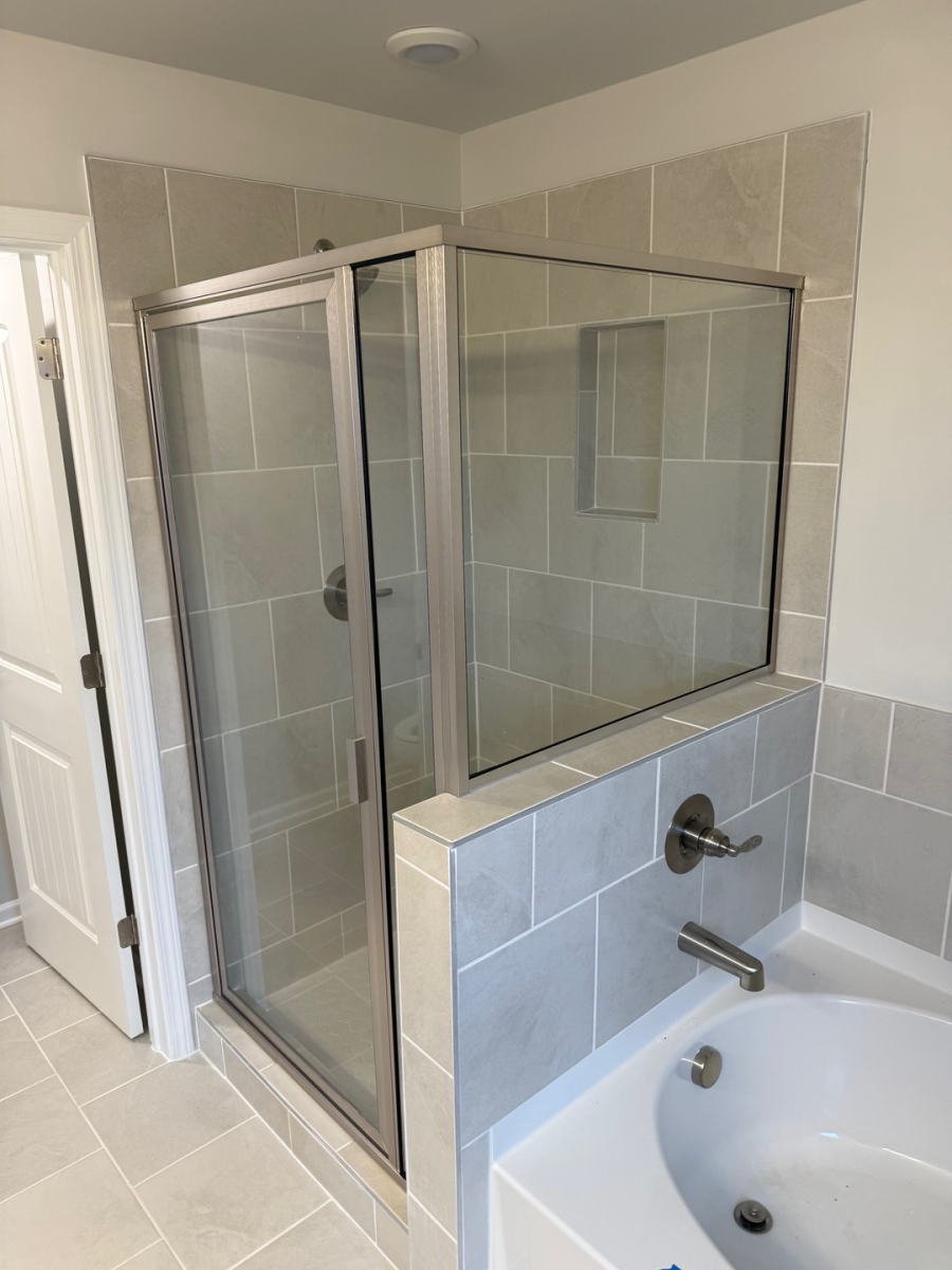 Fixed glass shower panel with clean edges and minimal hardware, installed in Roswell, GA.