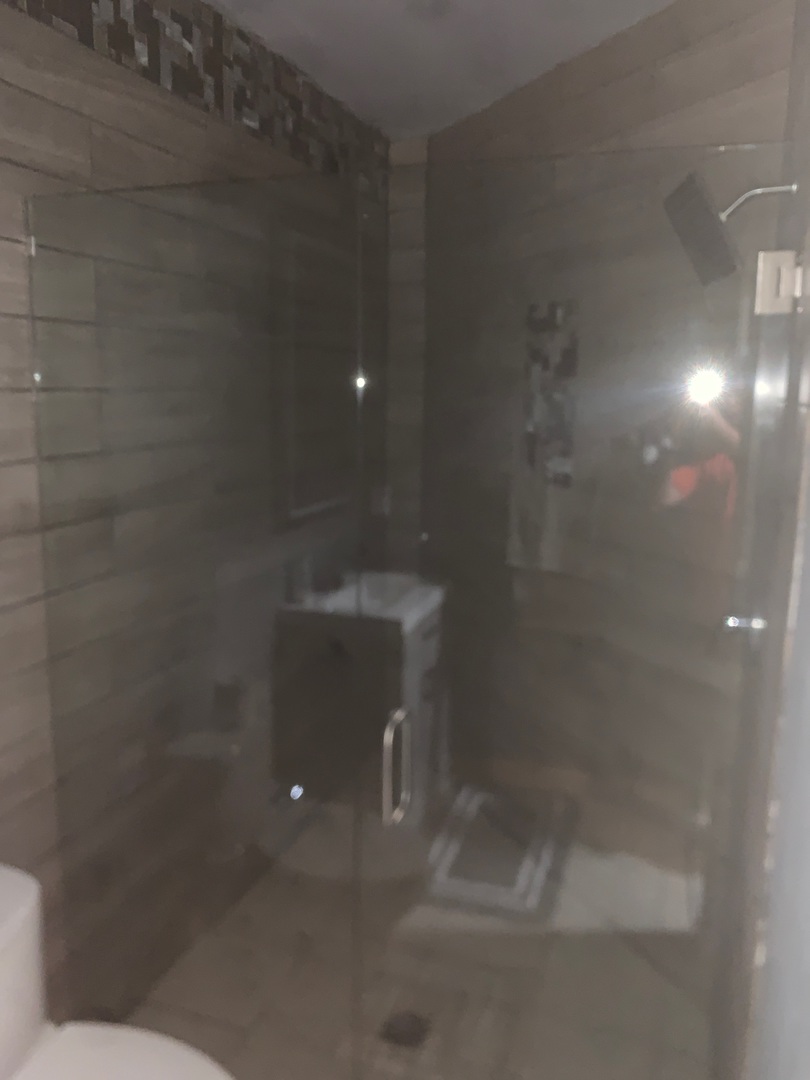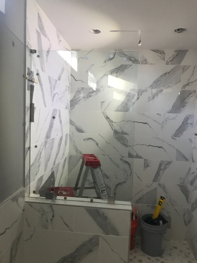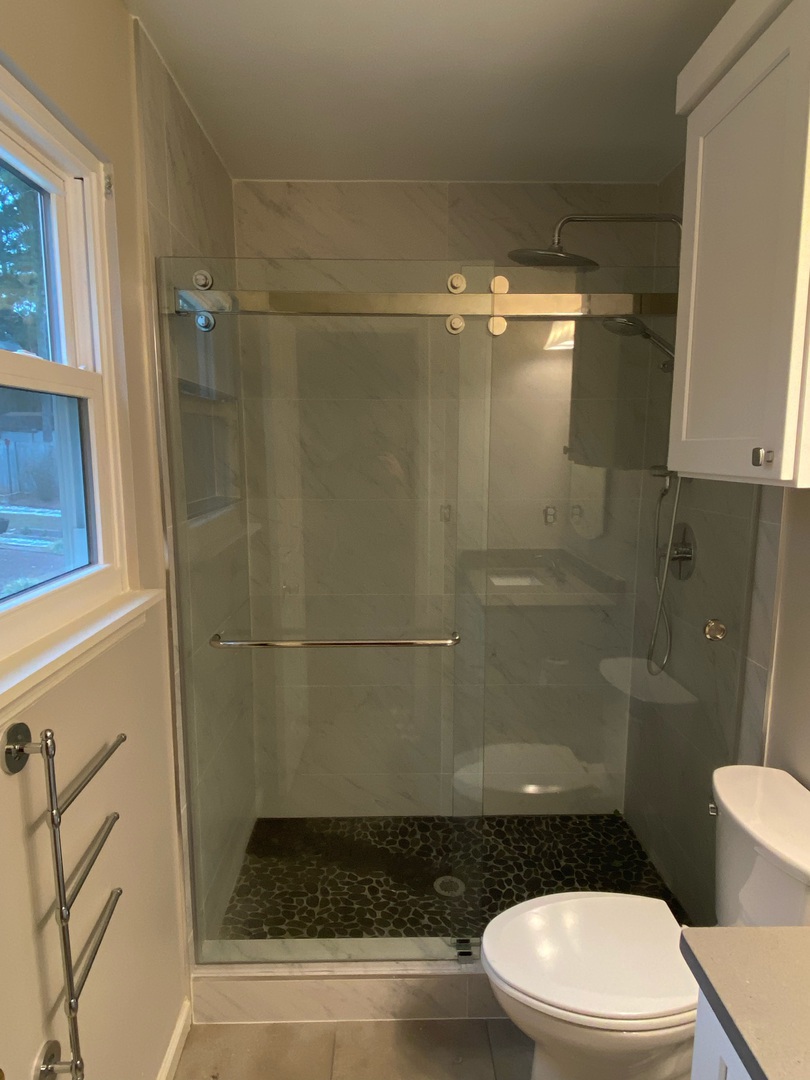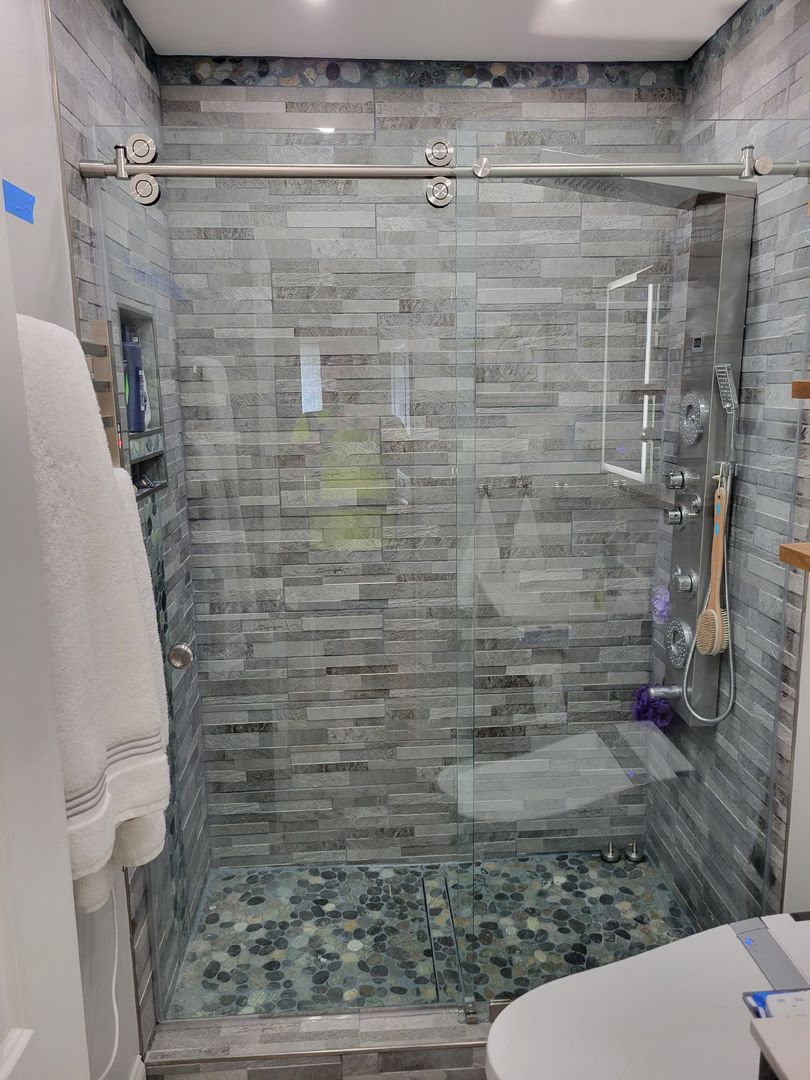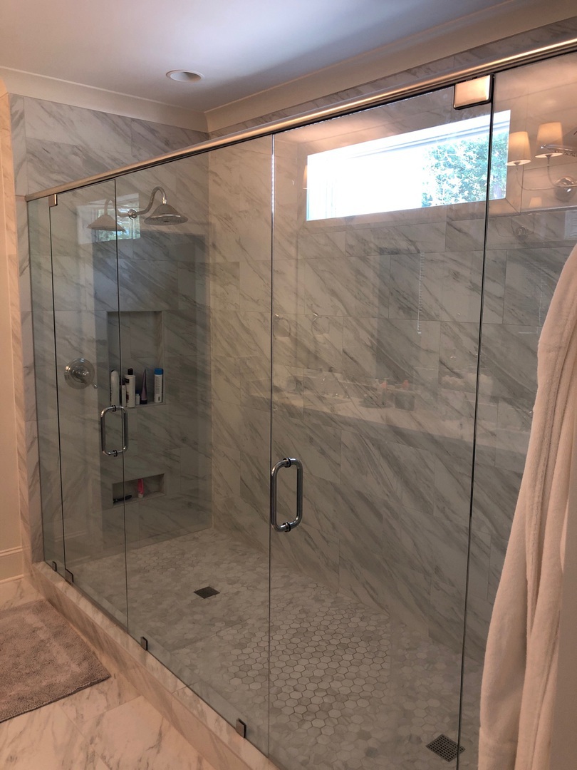 Frameless sliding shower door with stainless steel hardware, installed in Dunwoody, GA.