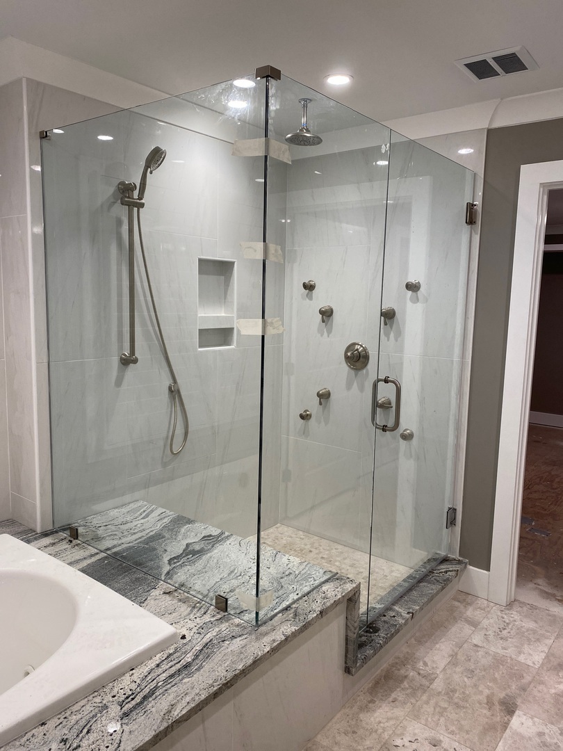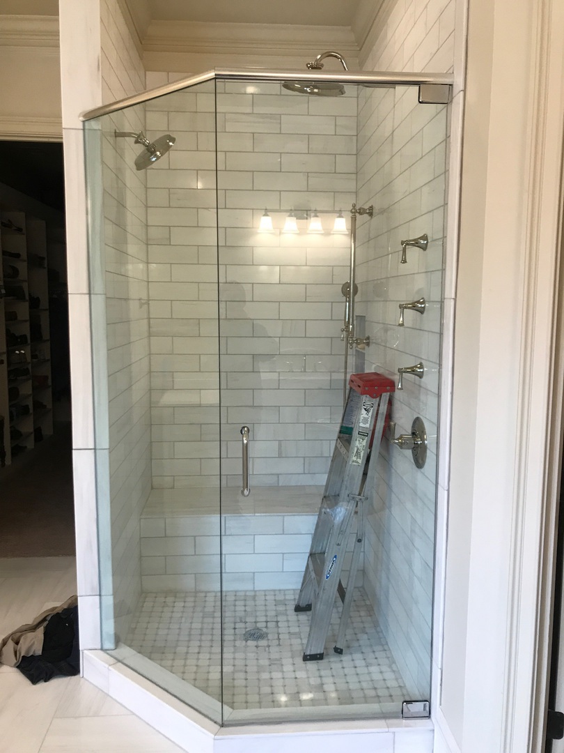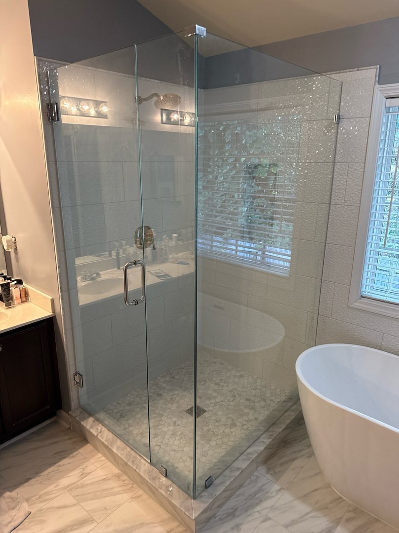 Frameless corner shower enclosure with clear glass panels, installed in Johns Creek, GA.