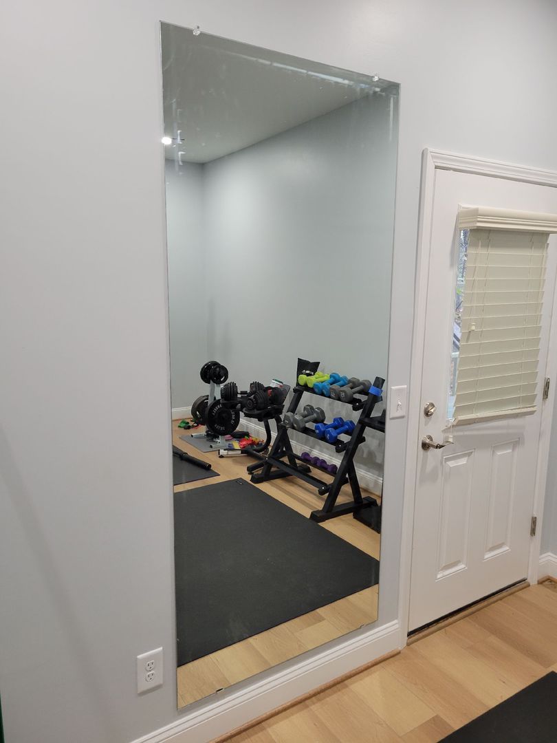 Custom wall-to-wall gym mirror with polished edges, installed in McDonough, GA.