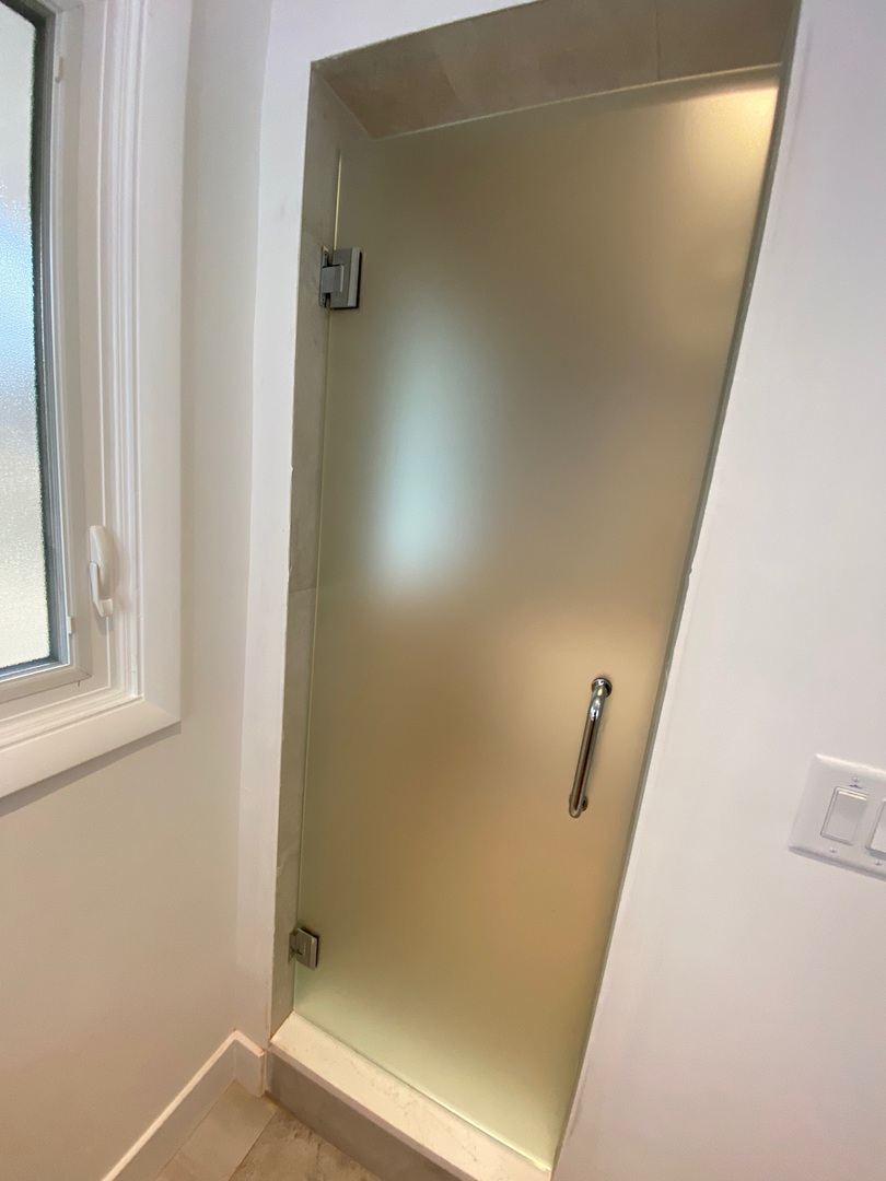 Frosted glass swing shower door with polished chrome hinges and handle, installed in Sandy Springs, GA.