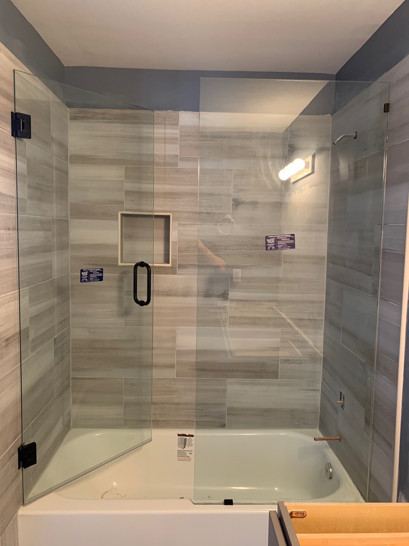Frameless tub enclosure with clear glass panels and minimal hardware, installed in Decatur, GA.