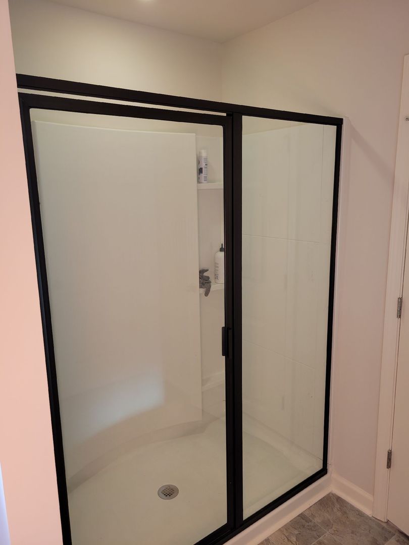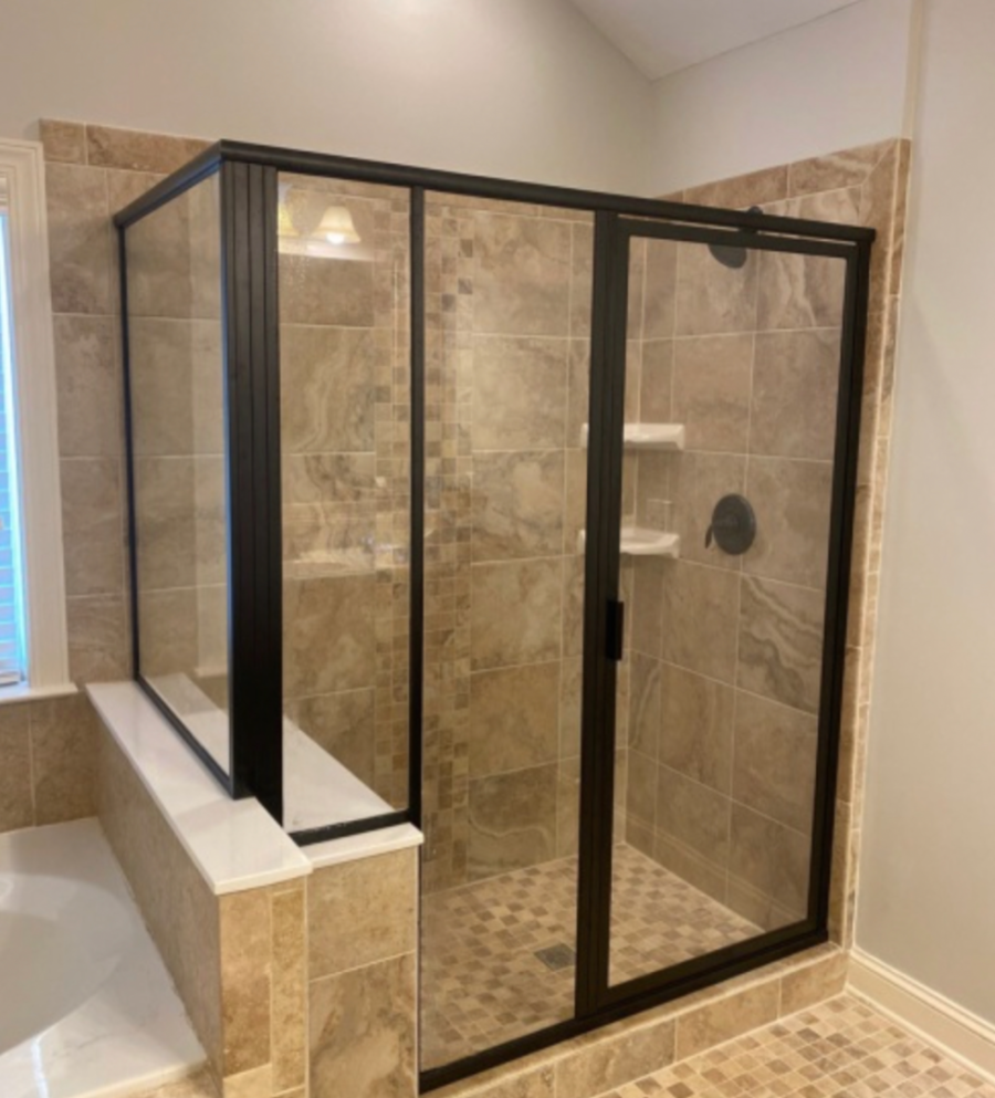 Framed swing shower door with matte black finish, installed in Lawrenceville, GA.