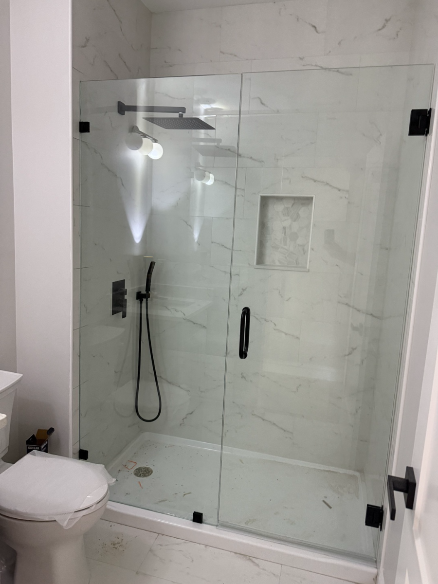 Frameless shower enclosure with matte black hinges and handle, installed in Braselton, GA.